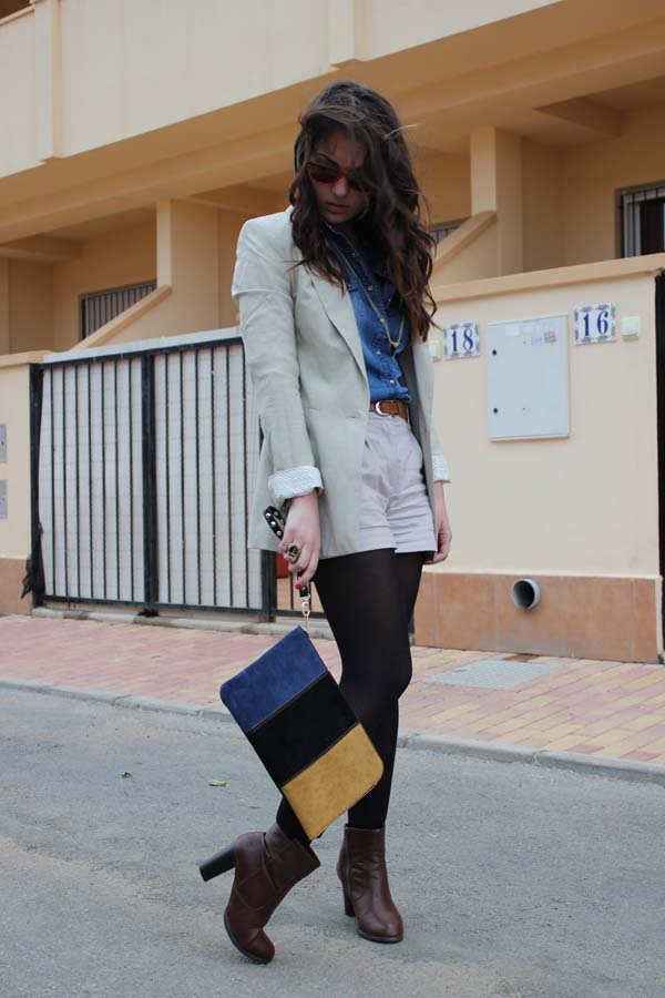 El de hoy es un look denim (recomendado comprar una camisa vaquera en rebajas) con shorts, en marrón y azul. No soy partidaria de combinar dos prendas vaqueras, no suele coincidir el tono y no me termina de convencer. Por este motivo, suelo optar por el beige o el negro para la parte inferior.