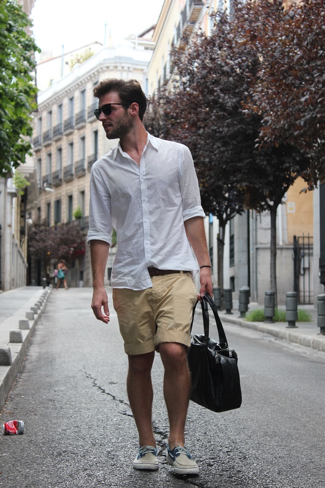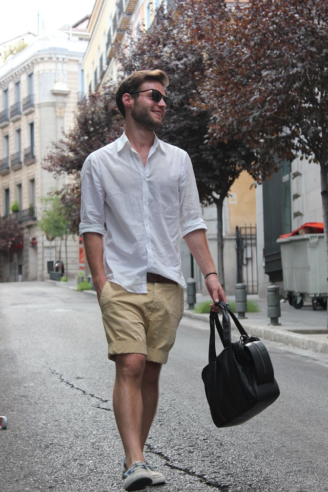 Julián completó su look con unos chinos cortos de color camel y unos náuticos. Desde aquí hago un llamamiento a todos los que dicen que el negro y el marrón no quedan bien juntos. El estilismo de hoy está compuesto por blanco, marrón y azul marino, sin embargo el bolso es negro y combinado con las gafas del mismo color queda fenomenal.