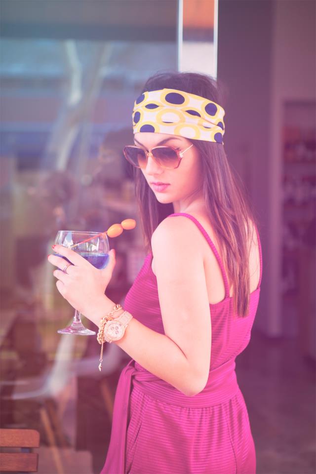 Elegí un mono de color frambuesa de los años 80 con un bolsito de los 60 y la cinta del pelo para darle el toque ‘boho-chic’. Este es el estilo que he incluido en mi maleta para las vacaciones hasta cansar. Me parece una combinación perfecta para ir fresquita con el calor, cómoda y chic al mismo tiempo. Es un estilismo con el que me imagino perfectamente yendo de un lado para otro en el tan esperado crucero o tomando una copa en el bar de moda con vistas a la playa.