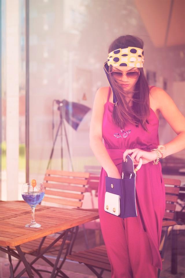 Elegí un mono de color frambuesa de los años 80 con un bolsito de los 60 y la cinta del pelo para darle el toque ‘boho-chic’. Este es el estilo que he incluido en mi maleta para las vacaciones hasta cansar. Me parece una combinación perfecta para ir fresquita con el calor, cómoda y chic al mismo tiempo. Es un estilismo con el que me imagino perfectamente yendo de un lado para otro en el tan esperado crucero o tomando una copa en el bar de moda con vistas a la playa.